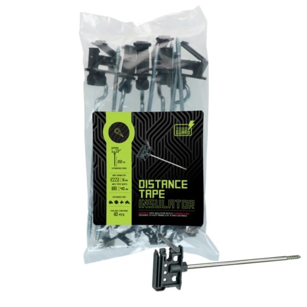 ZoneGuard afstand lintisolator 22cm - 40mm - 10 stuksAfstand lintisolatorGeschikt voor draad, koord (6 mm) en lint tot 40 mm. Verzinkte steun 22 cm.Zonder doorgaande kern.H